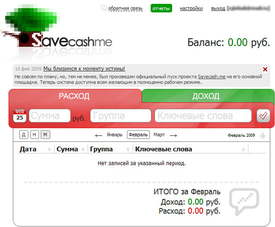 Вы первый раз зашли на главную страницу Системы бюджетного планирования Savecash.me. Перед вами пусто: нулевой баланс, пустая таблица доходов и расходов, отсутствие итоговых данных. Все изменится буквально через несколько минут!