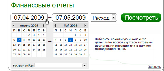 Для построения финансового отчета вам, перво-наперво, необходимо выбрать временной интервал. По умолчанию выбраны последние 30 дней. Введите начальную и конечную даты, либо выберите их при помощи календарей. Укажите тип отчета — доход или расход и нажмите «Посмотреть».