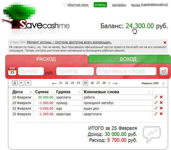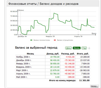 Добавив в Систему несколько записей, вы видите, как увеличивается ваша таблица доходов и расходов. Вы можете настроить отображение данных в любом удобном для вас масштабе: день, неделя, месяц. Вверху вы всегда видите ваш баланс средств. Если он станет красным — срочно ищите где достать деньги!