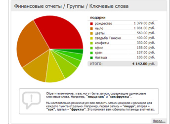 Подраздел Распределение доходов или расходов по группам поможет выявить самые прибыльные/затратные группы и их распределение в вашем бюджете. В каждой группе можно посмотреть отчет по ключевым словам.