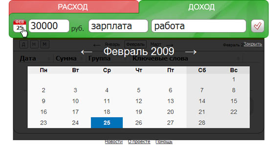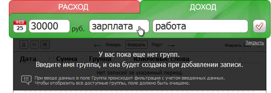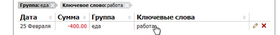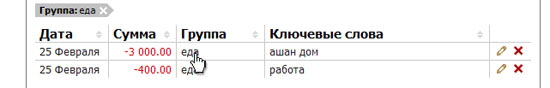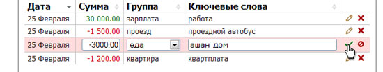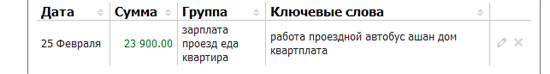Чтобы отредактировать запись, достаточно нажать на соответствующий ярлычок напротив данной записи. Отредактируйте дату, сумму (при наличие знака «минус» запись считается расходом, при отсутствии — доходом), группу и ключевые слова. По окончании редактирования нажмите на иконку «сохранить».